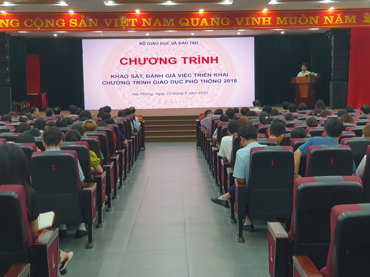 Dưới sự điều hành của các đồng chí lãnh đạo, chuyên viên Bộ Giáo dục và Đào tạo; lãnh đạo, chuyên viên Sở Giáo dục và Đào tạo; các cán bộ quản lý giáo dục và giáo viên đánh giá tình hình sau một năm thực hiện Chương trình Giáo dục phổ thông 2018 đối lớp 10 cấp THPT và năm thứ hai đối với lớp 6,7, cấp THCS.