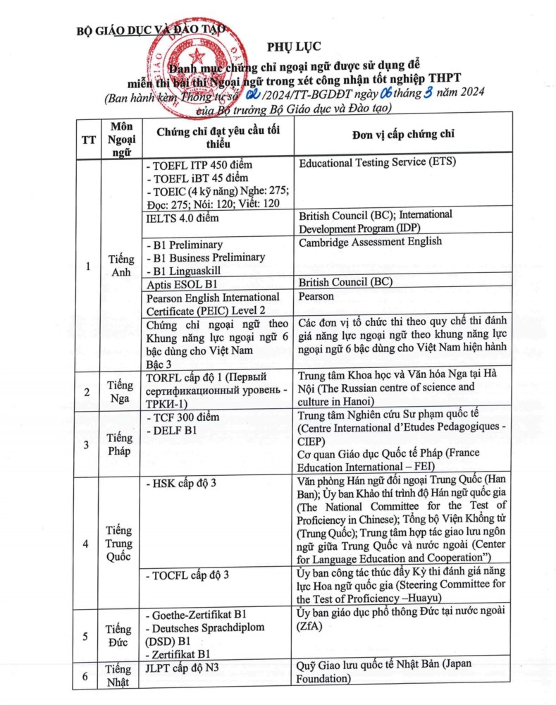 Danh mục chứng chỉ ngoại ngữ để miễn thi ngoại ngữ tốt nghiệp THPT