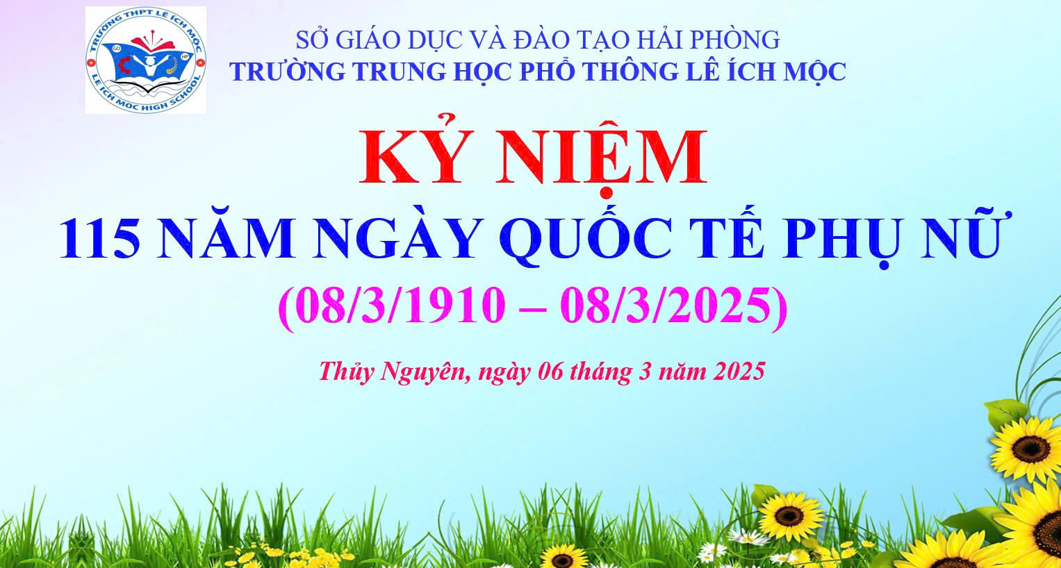 Nhân ngày Quốc tế Phụ nữ 08-03, kính chúc các Nữ cán bộ, giáo viên, nhân viên nhà trường sức khoẻ dồi dào, gia đình hạnh phúc, thành công trong sự nghiệp trồng người. Chúc các nữ sinh trường THPT Lê Ích Mộc vui vẻ, học tập rèn luyện tiến tới.