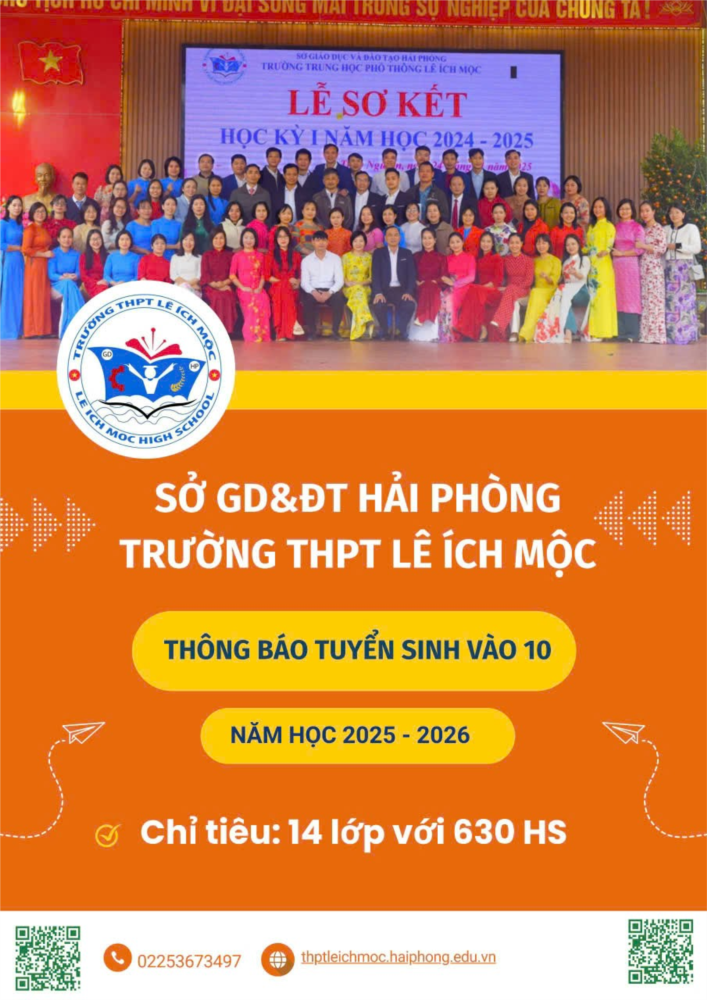 Năm học 2025-2026 trường THPT Lê Ích Mộc được UBND Thành phố Hải Phòng giao chỉ tiêu tuyển sinh vào lớp 10 là 14 lớp với số lượng 630 học sinh. Cơ sở vật chất nhà trường 40 phòng học khang trang và đầy đủ phương tiện giảng dạy; có sân tập, nhà đa năng, các dãy phòng chức năng và phòng thực hành sẽ mang lại cho học sinh môi trường học tập tốt nhất.